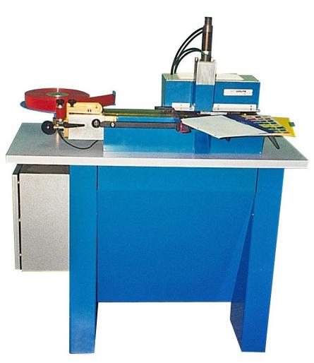 A semi-automatic machine, but with an automatic cycle that cuts, rounds corners and positions the polyester foil (off a 600 m roll), then immediately seals the thus positioned TAB. I.e. when the sheet is presented to the machine, the TAB is automatically sealed at the pre-set location.